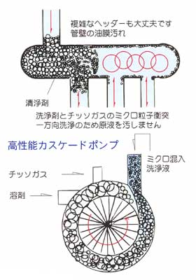 ポンプを最初2〜3秒運転します、様子を見て2〜3分間運転して吐出バルブを閉じます と同時にループのエア抜きバルブより空気を抜きます、一番遠いバルブで行います。空気抜きが出来たところでポンプを連続運転します。このとき供給タンクは大気圧のチッソガスを掛けておき、タンクの真空破壊を防ぎます。ポンプの運転により返り管にオイル混じりの溶剤が戻ってきます、所定量の溶剤が戻ったところで返却タンクの溶剤を別の空き缶に回収します。溶剤の色合いで2回目を行うか判断します。1回の洗浄で20リットル使用すると、10φとすれば2000回の洗浄をした事になります。 大概は1回で充分です。バルブ操作は馴れてくるといろいろの操作が出来ます。