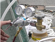 まず供給タンク?に溶剤メチクロを入れます、このとき配管の長さに応じて配管容積を本体付属の別表より計算して2倍量投入します。チッソガスボンベに連接したゴムホースをセットします。チッソガスは大気圧程度で充分です。 (空き缶を忘れないように)