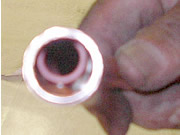 ![]() 7、洗浄後、切断銅管 あとで判ったことであるが、オイルの分解物の水素により酸化銅が還元されて内部がピカピカ光っている。洗浄されてきれいになったのではない。 ![]() |